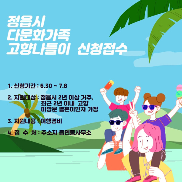 정읍시는 2010년부터 다문화 고향 나들이 지원사업을 추진해 2019년까지 총 145가정 534명에게 고향 나들이를 지원했다.