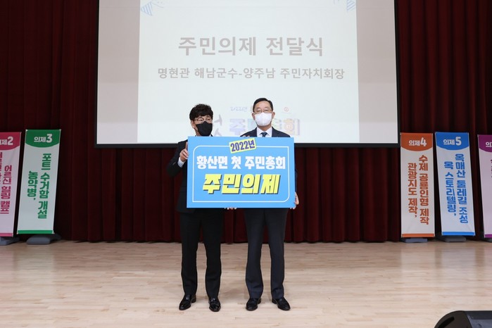 황산면 주민자치위원회는 해남군에서 자체 실시한 읍면 장기발전계획 수립 공모사업을 통해 지난 2020년부터 주민 교육과 자원 조사 등을 실시해 지역 특성에 맞는 의제 계획을 발굴해 왔다. 지난해에는 주민자치회가 출범하면서 본격적인 주민자치활동에 돌입, 이번 주민총회를 통해 우리지역의 과제를 주민 스스로 해결해 나가는 주민자치의 첫 발을 힘차게 내디뎠다.