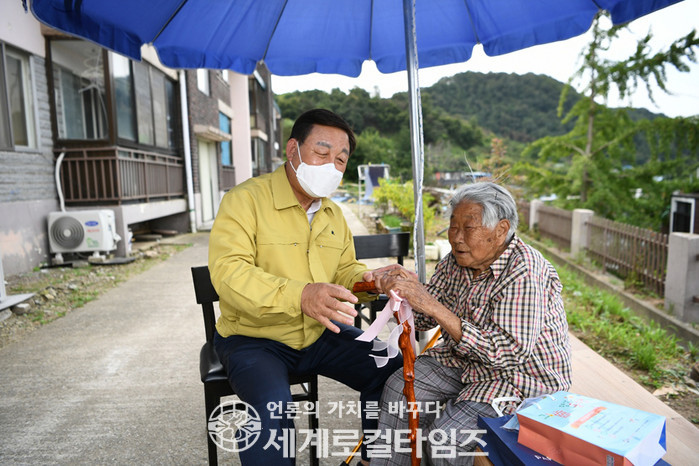 [세계로컬타임즈 안정순 기자] 충남 예산군은 제24회 노인의 날을 기념해 지난 29일 예산읍에 거주하는 이 모(100) 어르신에게 장수지팡이 ‘청려장’을 전달하고 무병장수를 기원했다.