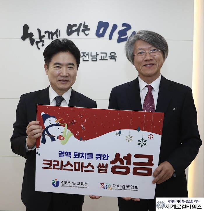 [세계로컬타임즈 김명진 기자] 전라남도교육청은 11일 청사 교육감실에서 대한결핵협회 광주·전남지부(지회장 박종)와 ‘2023년도 크리스마스 씰 증정식’을 갖고 결핵 퇴치를 위한 성금을 전달했다.