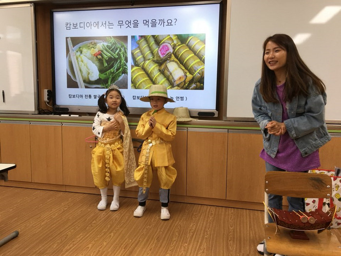 | ▲ 전남 영광교육지원청이 실시하는 다문화가정 학부모 모국 문화교실에서 캄보디아 출신 한 학부모가 자국 문화를 학생들에게 설명하고 있다. <사진제공=영광군 교육지원청> |