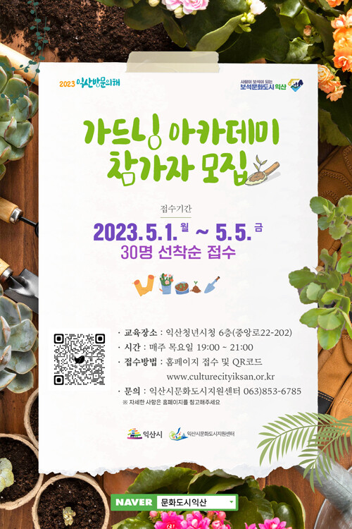 원도연 익산시문화도시지원센터장은 “시민들이 자연과 가까워지며 공간을 아름답게 꾸미는 즐거움을 일상 속에서 느끼길 기대한다”며 “백제왕실 정원을 상상하며 꾸미는 내집안 정원을 통해 녹색힐링 문화도시 익산 조성을 위해 노력하겠다”고 말했다.