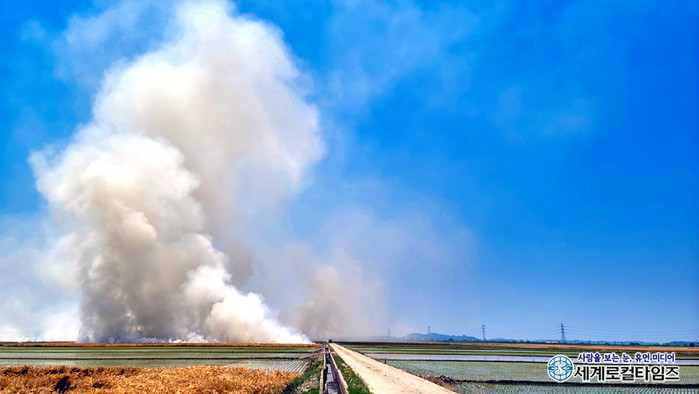[세계로컬타임즈 글·사진 조주연 기자] 30일 오후, 전북 김제시 청하면 한 농지에서 거대한 연기가 하늘로 피어오르고 있다. 누군가 논을 태워 발생한 연기로 보인다.