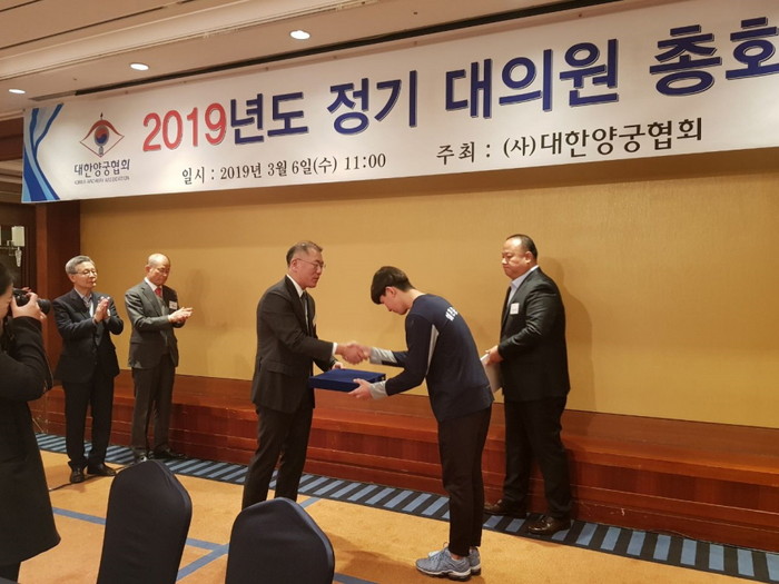 대한양궁협회는 6일 서울그랜드인터콘티넨탈호텔에서 개최된 2019년도 정기대의원총회에서 김제덕 선수에게 우수 선수상을, 김도영 경상북도양궁협회장에게 감사패를 수여했다.