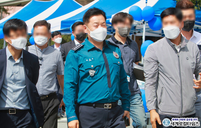 [세계로컬타임즈 글·사진 조주연 기자] 26일 오후, 전북 완주군에 위치한 우석대학교 체육관에서 더불어민주당의 대선 후보 선출을 위한 전북지역 경선이 진행된 가운데 권현주 완주경찰서장이 합동연설회장 주변을 점검하고 있다.