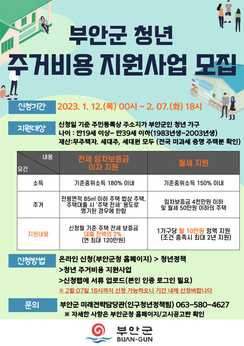 거주 주택은 전용면적 85㎡ 이하 주택법상 주택(전세 임차보증금 이자), 임차보증금 4000만 원 이하 및 월세 50만 원 이하(월세)이어야 한다. 기초생활수급자, 주택 소유자, 정부 청년 주거(금융)지원 사업 참여자, 국가 및 지방자체단체에 근무하는 공무직과 공무원 등은 지원대상에서 제외되며 오는 2월 7일까지 부안군 청년정책 홈페이지에서 온라인 접수 가능하다.