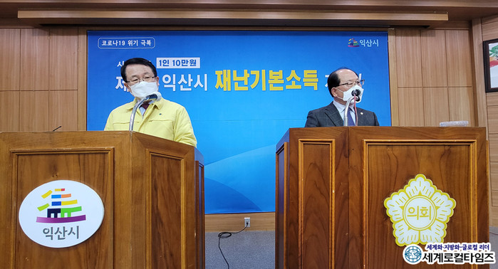 | ▲지난 1월 20일, 정헌율 익산시장과 유재구 익산시의장이 익산시 제2차 재난기본소득 지급과 관련한 브리핑을 하고있다. ⓒ조주연 기자 |