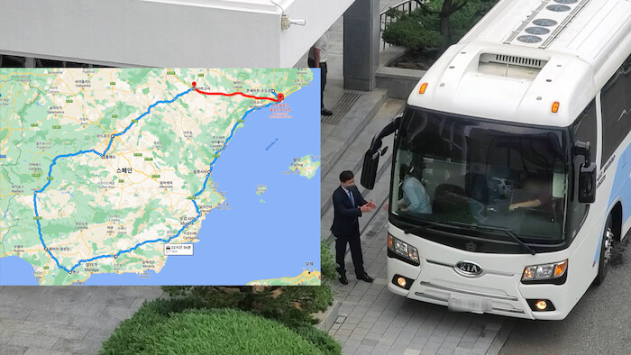 | ▲2022년 8월 10일 정성주 김제시장이 연수에서 돌아오는 김제시의회 의원들을 마중하고 있다. 지도는 지난 4일 김제시의회 의원 12명이 떠난 스페인 연수 일정 동선 ⓒ구글지도 ⓒ조주연 기자 |