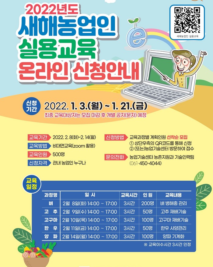 [세계로컬타임즈 박종현 기자] 무안군은 오는 2월 8일부터 14일까지 2022년 새해 농업인 실용교육을 비대면 방식으로 실시한다고 밝혔다.