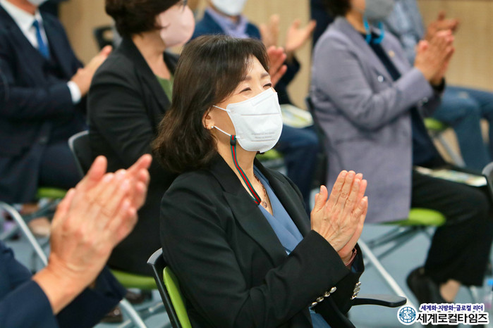 [세계로컬타임즈 글·사진 조주연 기자] 전북 김제교육지원청 김현정 교육장이 13일 오후, 김제시 장애인평생교육선터에서 진행된 장애인복지타운 조성 준공식에 참석해 축하를 보내고 있다. 김제시장애인복지타운은 총 4년여에 걸쳐 김제시 서암동에 장애인평생교육센터, 장애인보호작업장 증축, 장애인복지타운 주차장 등이 조성됐다.