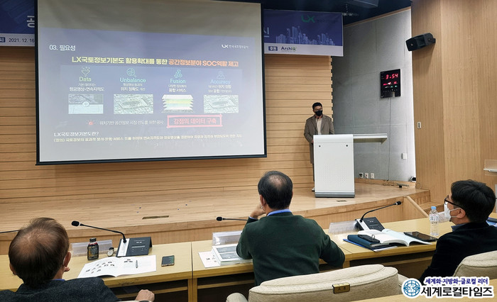 | ▲한국국토정보공사와 한국감정평가학회가 주최한 ‘2021 하반기 학술대회’에서 공사 드론융합부 이준호 차장이 ‘국토정보기본도 위상과 역할’을 주제로 발표하고 있다. ⓒ한국국토정보공사 |