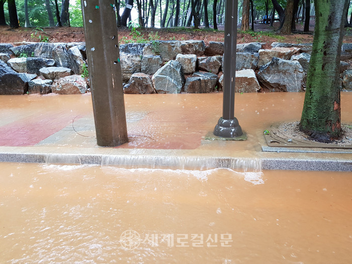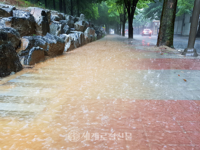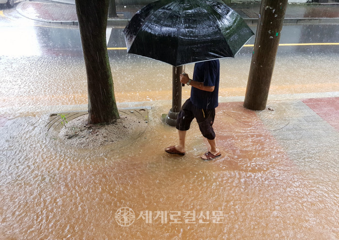 [세계로컬신문 조주연 기자] 1일 오후 내린 폭우로 전북 김제시 요촌 어린이공원 앞 인도(요촌동길 옆)가 물에 잠겨있다.