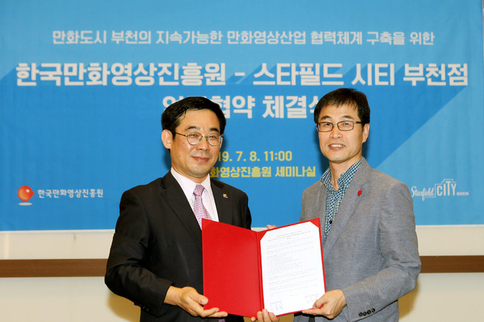 | ▲ 한국만화영상진흥원에서 신종철(왼쪽) 원장과 전종방(오른쪽) 스타필드 시티 부천점장이 업무협약 체결식을 갖고 기념촬영을 하고 있다. (사진=한국만화영상진흥원) |