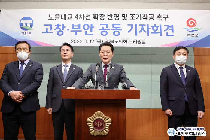 12일 권익현 부안군수와 심덕섭 고창군수는 전북도의회에서 기자회견을 갖고 노을대교 4차선 확장 및 조기착공을 위한 공동건의문을 통해 익산지방국토관리청 등 관련 기관의 대책 마련을 촉구했다.