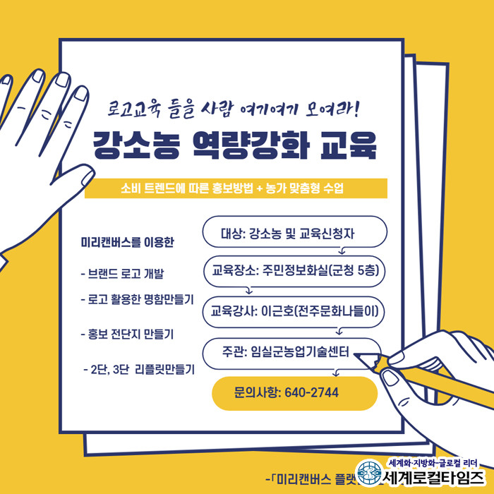 [세계로컬타임즈 조주연 기자] 전북 임실군이 오는 20일 강소농의 시장경쟁력 향상을 위해 브랜드 로고 개발 및 로고를 활용한 명함 만들기 교육을 추진한다.