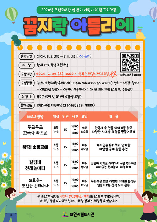 모현도서관은 초등학생 120명과 6~7세 아동 30명을 대상으로 다음달 5일부터 5월까지 총 10회에 걸쳐 ▲꿈지락 아틀리에 ▲꿈을 이루어 드림(Dream) ▲노스쿨데이 ▲북(BOOK)돋움 강좌를 운영한다.