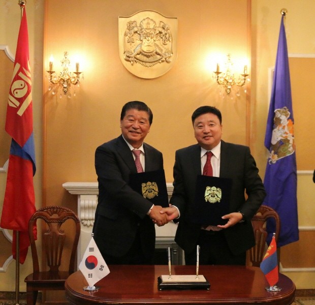 | ▲지난 14일 몽골 울란바타르시청에서 이석우 남양주시장(왼쪽)과 손도이 바트볼드 울란바타르 시장이 '남양주 다산 숲' 양해각서를 체결하고 기념촬영을 하고 있다. <사진제공=남양주시청> |