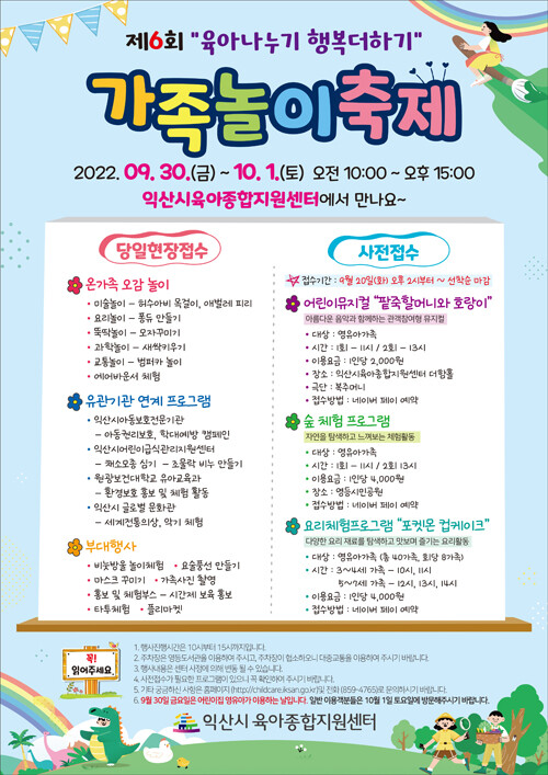 20일 익산시에 따르면 익산시육아종합지원센터는 오는 30일과 10월 1일 이틀에 걸쳐 영유아 가족들을 위한 ‘제6회 육아나누기 행복더하기 가족놀이축제’를 개최한다.