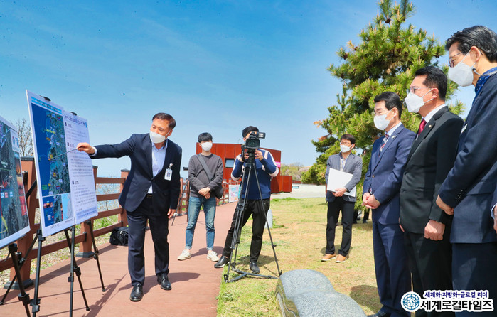 | ▲노을대교 건설사업과 관련해 정운천 의원에게 브리핑하고 있다. ⓒ부안군 |