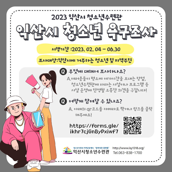 수집된 의견은 청소년수련관 시설개선과 청소년활동 프로그램 기획, 개발에 적극 활용될 예정이다. 또한 6월 말 조사 종료 후 결과를 지역 청소년 단체들과 공유해 익산시 청소년정책 개발 등에 반영할 계획이다.