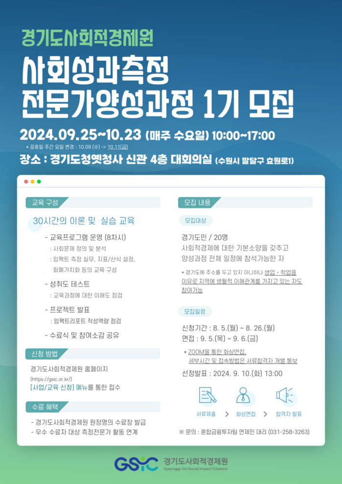 선발된 참가자는 경기도청 옛 청사 신관 4층 대회의실에서 9월 25일부터 매주 수요일 5주간, 총 30시간의 교육과정을 거치며 ▲사회문제의 정의와 분석 ▲임팩트 측정 실무 ▲임팩트의 화폐가치화 등 사회성과 측정에 대한 역량을 다지게 된다. 교육과정을 모두 이수한 수료자에게 경기도사회적경제원장 명의 수료증이 발급되며, 우수 수료자는 경기도사회적경제원 사회성과관리사업의 측정전문가로서 실무 경험을 쌓는 기회를 갖는다.