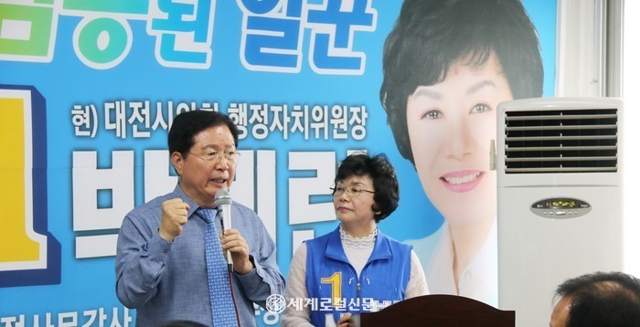 이 자리에서 박 후보는 "이번 선거는 대전의 맏며느니라는 캐치프레이즈를 가지고 3선에 이어 4선에 도전한다"며 "시의원 4년동안 지역에 관심과 노력을 기울여 총 사업비 495억원의 하수관로 집관공사가 시작됐고 앞으로 문화시설 등 숙원사업이 완성될 수 있도록 다음 임기 중 더욱 더 매진하겠다"고 목소리를 높였다.