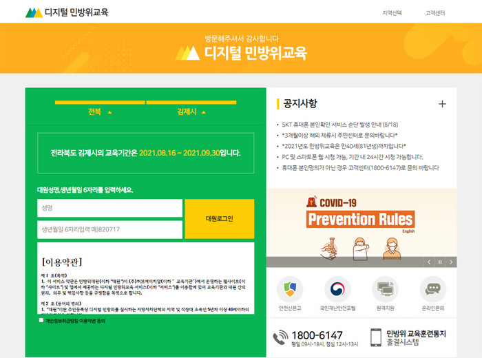 [세계로컬타임즈 조주연 기자] 전북 김제시가 상반기 민방위교육 미이수 대원을 대상으로 사이버교육(1차 보충)을 실시한다.